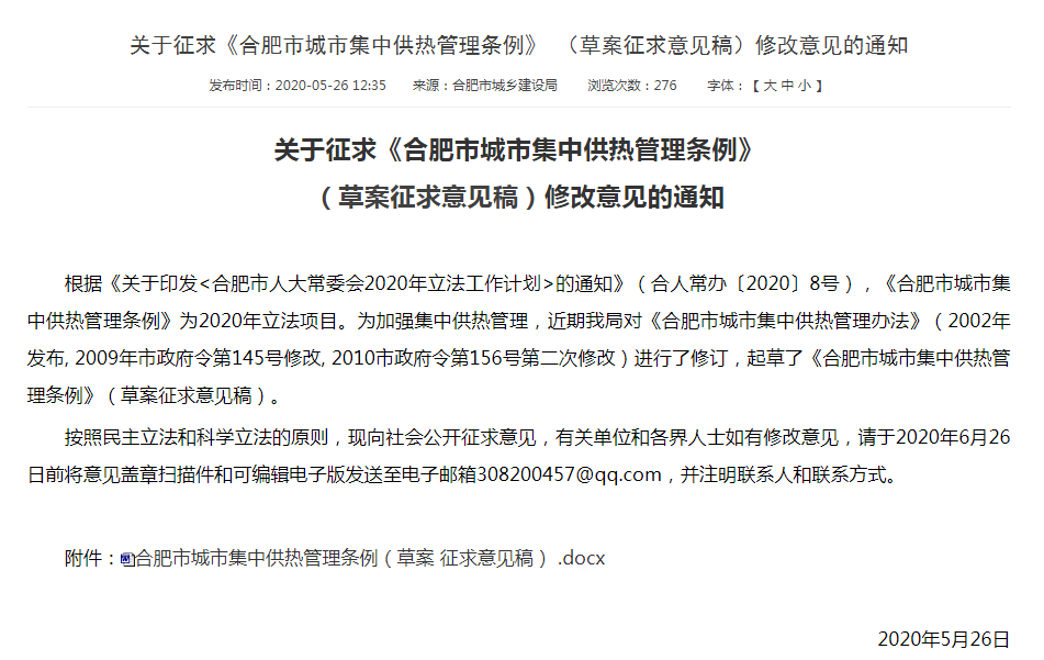 关于征求《合肥市城市集中供热管理条例》 (草案征求意见稿)修改意见的通知